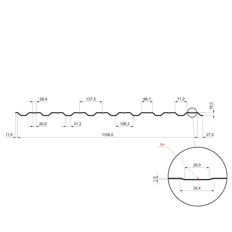 | Popis produktu | Profil TR 18B+ je určený na fasádnu plochu. Najčastejšie používaný na priemyselné, alebo hospodárske budovy. Vďaka automatizovanému procesu výroby Vám ho vyrobíme v požadovaných dĺžkach na mieru, čo umožňuje realizovať aj netypické objednávky. V ponuke máme širokú farebnú škálu 50 farieb a rôznych povrchových úpravách a materiáloch. Vyrobený je vo veľmi vysokej kvalite, ktorá zaručuje že vydrží veľa rokov v dokonalom technickom aj vizuálnom stave. Obsahuje prelis, ktorý je určený na zvýšenie nosnosti a zlepšuje vizuálnu stránku trapézu. |