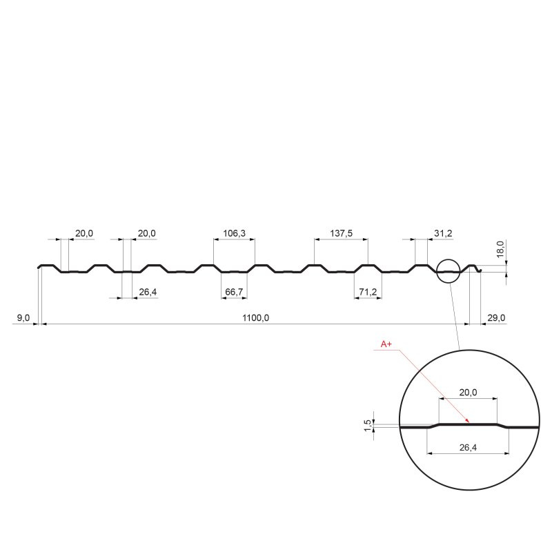 | Popis produktu | Profil TR 18A+ je určený na strešnú plochu s minimálnym sklonom 8° bez priečneho spoja a 10° s priečnym spojom, s presahom min. 200 mm. Prelis je určený na zvýšenie nosnosti a zlepšuje vizuálnu stránku trapézu. Najčastejšie používaný na priemyselné, alebo hospodárske budovy. Vďaka automatizovanému procesu výroby Vám ho vyrobíme v požadovaných dĺžkach na mieru, čo umožňuje realizovať aj netypické objednávky. V ponuke máme širokú farebnú škálu 50 farieb a rôznych povrchových úpravách a materiáloch. Vyrobený je vo veľmi vysokej kvalite, ktorá zaručuje že vydrží veľa rokov v dokonalom technickom aj vizuálnom stave. |