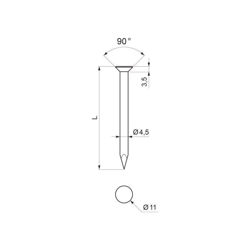 | Popis produktu | Klinec s hlavou o priemere 11 mm, určený predovšetkým k upevneniu strešných žľabových hákov ku krovu. Upevňovací otvor v háku je prispôsobený pre kužeľovú hlavu klinca. |