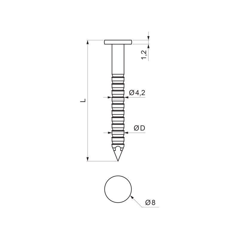 | Popis produktu | Klinec lepenkový konvexný na pripevnenie tenkých materiálov k dreveným podkladovým konštrukciám. Široká hlava o priemere 8 mm zabraňuje vytrhnutiu materiálu. Konvexný tvar drieku klinca zvyšuje odolnosť voči uvoľneniu klinca z materiálu. |