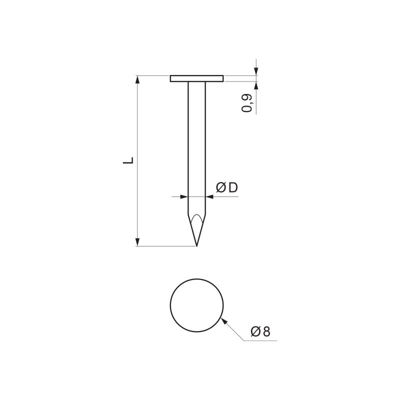 | Popis produktu | Klinec lepenkový je určený na pripevnenie tenkých materiálov k dreveným podkladovým konštrukciám. Široká hlava o priemere 8 mm zabraňuje vytrhnutiu materiálu. |